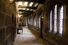 College House, the original 15th-century college, is a Grade I listed building built of sandstone in the shape of a lowercase 'b' with a slate roof. It is accessed by the original gatehouse;[7] which was constructed on a plinth and contains the original timbers. The upper storey is accessed by an external staircase.[77] Baronial Hall, once the Great Hall, contains many of its original features, such as its timber roof, dais and canopy. There is a large fireplace dating from the 19th century,[78] and three windows likely to date from the 16th century.[79] The Audit Room, originally a common room,[80] contains a panelled ceiling with decorations suggesting it was installed by the Stanley family.[81] The upper room, originally the warden's chamber,[80] is now the library reading room, and contains a large bay window within an elaborate Tudor arch,[81] as well as original 17th-century doors.[82] The west part of the building surrounding the cloister courtyard contained accommodation known as sets, for people who lived in college.[83] There were two rooms in each set on two floors, the lower floor being used as a study.[84] Historian Clare Hartwell, describes the cobbled courtyard which has a restored well as "one of the most atmospheric spaces in the building".[83] It is surrounded by many windows, which were probably originally unglazed.[85] Inside there are several corridors and passages containing open beams and original stonework.[84] To the east is the kitchen and associated rooms,[86] and further east are rooms used for administration offices, most of which have been substantially altered.[87]