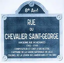 In 1747, when Georges Bologne was accused of murder, he fled to France. The next year he was visited by his wife, Nanon, and his son. After two years he was granted a royal pardon and returned to Guadeloupe.[16] In August 1753, Joseph aged seven, was taken to France for his education, and installed in a Jesuit boarding school in Angoulême so his uncle Pierre could keep an eye on him. The couple accompanied by Nanon returned to Guadeloupe.[17] Two years later, on 26 August 1755, listed as passengers on the ship L'Aimable Rose,[18] Bologne de Saint-Georges and only Nanon landed in Bordeaux.[19] Reunited with their son Joseph, they moved into a spacious apartment in the 6th Arrondissement (Rive Gauche).[20][21]