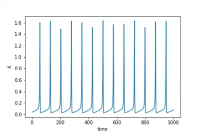 in which, is called activation or action potential variable, and is the recovery variable. The model has four parameters, is a time-dependent additive perturbation or a constant bias, is the time constant of recovery , is the activation-dependence of the recovery process and is an offset constant. The model has a rich dynamics, presenting from oscillatory to chaotic behavior,[4][5] as well as non trivial responses to small stochastic fluctuations.[6][7]