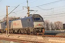The HXD2C is a 6 axle Co′Co′ freight locomotive which shares a similar exterior design with the HXD2B. The individually inverter controlled traction motors, body structure overall structural design also are the same as other members of the series;[1] with transformers from ABB.[2] The locomotive power is reduced to 7.2 MW (9,700 hp), suitable for trains of 5,000–6,000 tonnes (4,900–5,900 long tons; 5,500–6,600 short tons). The locomotive can be ballasted to give axle loads from 23 to 25 tonnes (22.6 to 24.6 long tons; 25.4 to 27.6 short tons).[1] The HXD2C locomotives are constructed by CNR Datong.[3]