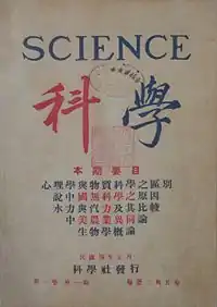 The Science Society of China (simplified Chinese: 中国科学社; traditional Chinese: 中國科學社, 1915-1960) was a major science organization in the modern history of China. It was initiated by Chinese students at Cornell University in 1914, including P.C. King, H. C. Zen, Zhou Ren, Hsingfo Yang and later renamed Science Society of China. In 1915 it began publication in China of a major journal, Kexue (Science), which was patterned on the journal of the American Association for the Advancement of Science. In 1918 Science Society of China founded headquarters in Nanjing. In 1922 the Society established a major biological research laboratory in Nanjing. The Society devoted itself to the popularization of science, the improvement of science education, the standardization in Chinese translation of scientific vocabularies, and participation in international scientific meetings. It was the leading scientific organization in China prior to the establishment of government-sponsored Academia Sinica (1928) and Chinese Academy of Sciences (1949).[1][2]