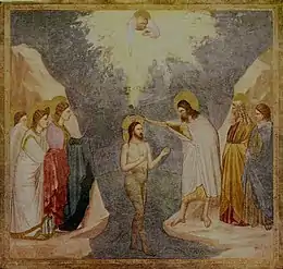 Jesus was baptised by John the Baptist in the River Jordan.[43][44][45] Jesus was almost certainly naked when he was baptised. The early Christian liturgy of baptism required those being baptised to be completely naked.[46]