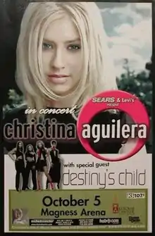 Christina Aguilera in Concert was the debut concert tour by American singer Christina Aguilera. It supported her two studio albums, Christina Aguilera (1999) and Mi Reflejo (2000). Beginning in May 2000 with appearances at radio festivals in the United States, the tour continued into Canada. Here, Aguilera headlined Psyko Blast, a pop music tour created by Canadian network, YTV. The singer returned to the US performing at state and county fairs before headlining shows in amphitheatres and arenas. The tour continued into 2001, visiting Mexico, Puerto Rico, Panama, Venezuela and Japan. Sponsors of the tour included Sears,[1] Levi's, J-Wave and Pioneer.