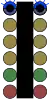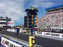 Modern drag races are started electronically by a system known as a Christmas tree. A common Christmas tree consists of a column of seven lights for each driver or lane. Each side of the column of lights is the same; from the top down, there are a blue LED light set (top and bottom halves), then three amber bulbs, then a green bulb and a red bulb.[1] Prior to 2011, the function of the blue light set was performed by four smaller amber bulbs.