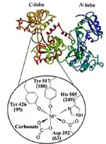 Transferrin, in addition to chromodulin has been identified as a major physiological chromium transport agent,[20][22] although a recent study found that Cr3+ in fact disables transferrin from acting as a metal ion transport agent.[23] While transferrin is highly specific for ferric ions, at normal conditions, only 30% of transferrin molecules are saturated with ferric ions, allowing for other metals, particularly those with a large charge to size ratio, to bind as well.[8][12][21] The binding sites consist of a C-lobe and an N-lobe which are nearly identical in structure.[21] Each lobe contains aspartic acid, histidine, 2 tyrosine residues and a bicarbonate ion that acts as a bidentate ligand to allow iron or other metals to bind to transferrin in a distorted octahedral geometry.[20][21][22] Evidence supporting the binding of Cr3+ to transferrin comes from extensive clinical studies that showed a positive correlation between levels of ferritin and of fasting glucose, insulin, and glycated hemoglobin (Hb1Ac) levels.[8] Furthermore, an in vivo study in rats showed that 80% of isotopically labelled Cr3+ ended up on transferrin while the rest were bound to albumin. An in vitro study showed that when chromium(III) chloride was added to isolated transferrin, the Cr3+ readily bound transferrin, owing to changes in the UV-Vis spectrum.[12][20][24] The formation constant for Cr3+ in the C-lobe is 1.41 x 1010 M−1 and 2.04 x 105 M−1 in the N-lobe, which indicates that Cr3+ preferentially binds the C-lobe.[8][20][21] Overall, the formation constant for chromium(III) is lower than that of the ferric ion.[20] The bicarbonate ligand is crucial in binding Cr3+ as when bicarbonate concentrations are very low, the binding affinity is also significantly lower.[20] Electron paramagnetic resonance (EPR) studies have shown that below pH 6, chromium(III) binds only to the N-lobe and that at near neutral pH, chromium(III) binds to the C-lobe as well.[8] Chromium(III) can compete with the ferric ion for binding to the C-lobe when the saturation greatly exceeds 30%.[21] As such, these effects are only seen in patients with hemochromatosis, an iron-storage disease characterized by excessive iron saturation in transferrin.[24]