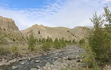 Churn Creek flows generally north before turning northeast on its final leg through grasslands, joining the Fraser River just south of the headquarters of the Gang Ranch and opposite the community of Dog Creek and associated creek. Most of its lower course is a heavily-eroded canyon lined by benchlands, and is protected in Churn Creek Protected Area, which also includes the ecological preserve of the Empire Valley Ranch.[1]