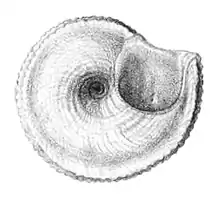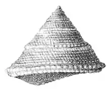 The shell is solid, trochiform and dirty whitish in color.[6] The spire is acutely conical.[6] The shell has 6 or 7 feebly concave whorls.[6] They are bearing arcuate and flexuous lines of growth and six or seven granulous lirae, whereof that immediately above the suture is the largest.[6] The body whorl is acutely angular at the periphery, encircled by two subequal granular ridges.[6] The base is concave near the circumference, then slightly convex, concentrically granosely ridged.[6] The ridges nearest the umbilicus are coarser than the others, and also arcuately radiately striated.[6] The shell has deep and narrow umbilicus.[6]
