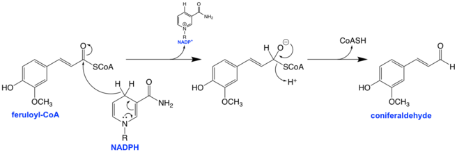 The mechanism for the reduction of the CoA thioester to the aldehyde involves a hydride transfer to the carbonyl carbon from NADPH, forming a tetrahedral intermediate with a formal negative charge on the oxygen atom. This negative charge is thought to be stabilized partially via hydrogen bonding with the hydrogen atoms of nearby tyrosine and serine side chains.[1][5] The serine and tyrosine residues are conserved across all CCRs as part of a catalytic triad along with lysine, which is thought to control the pKa of the tyrosine via electrostatic interactions with the ribose group of the NADPH.[1]