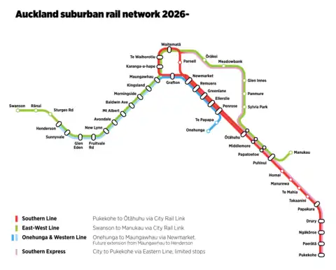 In July 2012, as part of the works around designating the route, Auckland Council released footprints for four stations. This included designation space for a not previously considered station on the current Western Line, just west of Dominion Road. This station would serve as an interchange station for passengers wanting to travel east in the Newmarket direction, in case the tunnel was built without an "Eastern Link" at the southern end that would allow trains exiting it to turn east.[34] The station was later dropped by Auckland Transport and the "Eastern Link" retained in the route protection documents.[35]