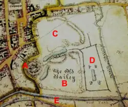 The castle was well developed by this time, and was reached through three gates positioned across the wider estate, called Nethergate (memorialised by today's Nethergate Street), Redgate and Dernegate.[18] The castle itself had four stone towers protecting the entrance to the inner bailey and the keep, called Auditorstower, Maidenstower, Constabletower and Oxfordtower.[18] Elizabeth built a chamber for her own use at the castle between 1346 and 1347.[19] A substantial water-garden, forming part of the moat to the east, existed at the castle during this period; it may have included a fountain and probably had a geometric form, possibly similar to the garden at nearby St Benet's Abbey in Norfolk.[20] Vineyards and orchards surrounded the property.[18] The castle's three parks continued in active use, and as part of the breeding programme, the deer were moved between them as they grew older.[21]