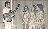 Wijewardena formed the Moonstones at the age of 21 with Annesley Malewana as lead vocalist.[7][5] Managed by an advertising icon, Sri Sangabo Corea, the group recorded several songs, which aired on the Saturday Star program in 1966. The young musicians were mentored by Sri Sangabo Corea, together with veteran Radio Ceylon/SLBC broadcasters Vernon Corea and Vijaya Corea. Their 1968 debut EP "Mango Nanda" was released on the JVPC007 Philips label selling up to 5,000 copies.[8] It included the songs Mango Nanda, Ruwan Puraya, Seetha Ude and Menike. Their second release "More Hits by the Moonstones" came out in November that year, on the Sooriya label and included the hits Kalu Mama, Rosa Male, Ramani and Goyam Kapanawa.[6] Later the song Mango Nanda was selected the best Sinhala song by the Hit Parade program on Radio Ceylon as well.[9] In 1969, the Moonstones welcomed female vocalist Indrani Perera who sang lead on the best selling hit Dilhani. Wijewardena himself only sang lead on Dileepa Podi Puthu an adaptation of a poem written by Karunaratne Abeysekera to his son.[5]