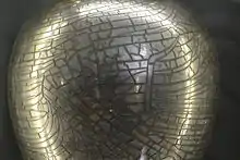 The central and largest room in the house is the great hall which was the original dining room and the accompanying screens passage which gave access to the hall from the service rooms. The staircase to the north of the hall was added in the 18th century. The state room on the western side of the first floor was damaged by fire in 1882; the oak panelling around the fireplace was brought from the Eltons' former house in Queen Square, Bristol. The chapel on the first floor has a rectangular window with reticulated tracery, which dominates the front of the house. The stained glass in the window was added after the 1882 fire.[34] The justice room has had a variety of uses but takes its name from its function as the manorial court until the 18th century.[35] The house contains many family portraits and other pictures as well as collections of Eltonware and Nailsea Glass and prints of bridges and railways.[36][37]