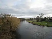 The most obvious local landmark is the River Tees on which the village stands. The Grade II listed George Hotel stands near the road-bridge which crosses the Tees coming from Piercebridge, and is said to be the home of My Grandfather's Clock which "stopped short never to go again when the old man died".[4][11][12] The 1789 bridge is the local major crossing since the Roman bridge on Dere Street was destroyed.[13][14] This bridge, of which the northern half is in County Durham and the southern half is in Richmondshire, is close by the old Roman road.[15] Kathleen Wood is next to Cliffe Hall, a surviving Victorian extension of a long-destroyed Georgian mansion. It is now a bed and breakfast establishment.[16][17]