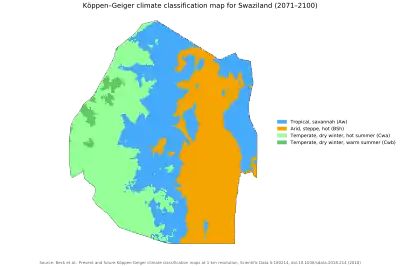 Eswatini also known as Swaziland, a landlocked nation located in Southern Africa, is characterized by a subtropical climate that features wet and hot summers as well as cold and dry winters.[1] The country has expressed concern regarding the impact of climate change on its existing social challenges, which include but are not limited to issues such as poverty, a high prevalence of HIV, and food insecurity. Furthermore, it is anticipated that climate change will significantly impede the country's development progress, by Vision 2022.[1]