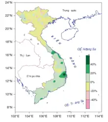 Unlike temperature, changes in rainfall trends vary significantly between regions. Statistics of rainfall over Vietnam for the period from 1961 to 2008 show a significant increasing trend in the South-Central Coast while it has tended to decrease in the northern coast (from approximately 17N northward). Another indicator is the annual maximum 1-day precipitation (RX1day). During 1961 to 2008, there is an increasing trend of up to 14% per decade for RX1day, which means that the extreme value of rainfall has been mounting.[9]