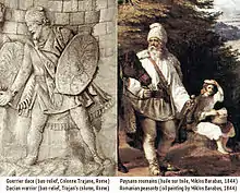 The Romanian popular costume finds its roots in the part of Thracian, Dacian and Getae ancestors and resembles that of the peoples of the Balkan Peninsula, of course with differences consisting of decorative and colourful details. For example, women's portraits carved on Trajan's Column in Rome after the Dacian Wars provide information about their clothing. Dacian women wore shirts rippled at the neck. Sleeves were either long and wide or short. The dress was long to the ground, over which sometimes was attached a wide draped mantle. In the feet, they wore leather sandals in summer and fur sandals in winter.[4]