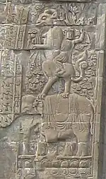 Both the north and the south arch have the same symmetrical decoration. On each side of each arch is a crossed vajra (viśvavajra), above which is an elephant surmounted by a youth riding a mythical creature.[12] At the peak of each arch is a garuda catching a pair of half-human, half-snake nagaraja.[13]