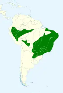 northeastern Argentina (Misiones, northeastern Corrientes, eastern Chaco, eastern Formosa), from Paraguay north through central/mideastern Brazil to northern Bahia[2] |