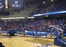 College Park Center is divided into two concourses. The lower surrounds the court/performance area while the upper section is shaped like a horseshoe. For end stage concerts, CPC can seat 6,400 spectators, with the lower bowl seating 3,600.[11] A 2,800-square-foot (260 m2) hospitality suite, divisible into three private sections is above the lower sections opposite the scorers table. The center-hung scoreboard is a four-sided Daktronics 13' X 9' with LED displays while an end-hung scoreboard is an 11' X 19' Daktronics LED display. Two LED display ribbon boards circle the bottom of the balcony seating. At the scorers table are four Daktronics LED display tables linked together to display messages and advertising.[12]