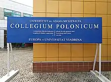 The Collegium Polonicum in Słubice is a joint academic unit of the Adam Mickiewicz University (Polish: Uniwersytet im. Adama Mickiewicza) in Poznań and of the Viadrina European University (German: Europa-Universität Viadrina) in Frankfurt (Oder). Its focus is on interdisciplinary scientific research and teaching on German-Polish, European, intercultural and cross-border issues.[3] Collegium Polonicum is also a branch (Polish: filia) of the Adam Mickiewicz University in Słubice, in whose building this joint unit is physically based.[4] This building had been erected in the years 1992–2001 by the Adam Mickiewicz University for the purpose of joint research and teaching activities with the Viadrina European University. As branch of Adam Mickiewicz University, Collegium Polonicum is one of four such units located outside Poznań and notably housing the Academic Secondary School for General Education in Słubice (Polish: Uniwersyteckie Liceum Ogólnokształcące w Słubicach[5]).