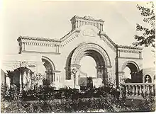 Calixto Arellano de Loira y Cardoso was also the designer of the main portal, of Romanesque inspiration. It is 21.66 meters high, 34.40 meters in length, and 2.50 meters in thickness, executed with variations by Eugenio Rayneri Sorrentino [lower-alpha 2] for and eventually crowned, by José Vilalta Saavedra, by the sculptural group Fe. Esperanza y Caridad (Faith, Hope and Charity). The first stone for its construction was placed on October 30, 1871, since 1868 burials have been carried out.[8]
