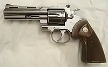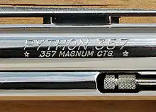 Al De John, who started with Colt in 1946 as a gunsmith, worked with factory superintendent Al Gunther. De John started to tinker with the .38 Special Office's Model Match beefing up the cylinder, frame, and top-strap due to problems with blowback and firing pins from the excessive pressure from the .357 Magnum hammering the recoil plate.[10] The recoil plate, a separate piece set into the frame, was eliminated by putting the firing-pin hole directly into the frame and making the top strap and crane more robust.[11] Al Gunther first suggested having the iconic vent rib across the barrel. The Python snake name for the revolver came from Colt sticking to their reptilian revolver naming, following the 1950 .38 Special "Cobra". Thus the "Python" was the second snake moniker for Colt's lineup.[12] The Colt Python was first introduced in 1955 as Colt's top-of-the-line model and was originally intended to be a large-frame .38 Special target revolver.[6] As a result, it features precision adjustable sights, a smooth trigger, solid construction, and extra metal. Pythons have a distinct appearance due to a full barrel underlug, ventilated rib and adjustable sights.[6] Colt revolver cylinders rotate clockwise compared to counter-clockwise of other revolvers (like Smith & Wesson or Ruger). When the revolver is at full cock, just as the trigger is pressed, the cylinder locks up for the duration of the hammer strike. As you press the trigger, the cylinder moves into lockup by the hand, and it is locked tightly. The Colt is locked up tight when the hammer falls. Colt claims that since the cylinder rotates to the right, this forces the cylinder into the frame, opposite of the Smith & Wesson.[13] Other revolvers have a hint of looseness even at full-cock. The gap between the cylinder and forcing cone is very tight, further aiding accuracy and velocity.[2]