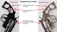 The second generation Colt Python was officially released by Colt in January 2020. The new second generation Pythons were strengthened and made to be more robust by being built out of stronger stainless steel than the first generation, increasing the steel mass of the backstrap, and thirty percent more steel beneath the rear adjustable sight. When Colts were first introduced, they were initially designed to shoot bullseye matches, and during the 1950s and 60's most shooters were using light .38 Specials for their matches. But as the Pythons became more widely adopted with law enforcement and shooters who ran their guns with higher powered .357 Magnum rounds, Pythons gained a reputation for being fragile when subjected to hard use with magnum loads. So for the second generation Colts, engineers redesigned the rear sight which allowed them to add 30 percent more steel above the cylinder in the top strap. Furthermore, the steel used in the second generation benefits of stronger modern metallurgy. The 410-series stainless steel Colt has used in Pythons since 1983 has been replaced with a stronger more corrosion resistant alloy.[19] It is available with a 3 in (7.6 cm), 4.25 in (10.8 cm) or 6 in (15 cm) barrel. The Colt Python is powered by a V-spring versus the Smith & Wesson’s leaf spring. Since the 2020-update, the V-spring has been redesigned into a "U" shape, in addition to simplifying and subtracting parts from the lockwork, to prevent "stacking", a phenomenon where the weight of pull sharply increases at the end of the trigger's travel. All new production Pythons are shipped with Altamont wood grips.[20]