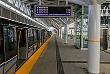 - A new platform (platform 5) to the east of platforms 3 and 4, which improves passenger traffic on those platforms by providing extra platform capacity for Waterfront station–bound Expo trains in anticipation of increased traffic at the station owing to initiatives such as the opening of the Evergreen stations on the Millennium Line.[15] Waterfront-bound trains at this station open their doors on both sides, allowing all-door boarding and alighting.[16]