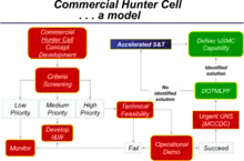 The term commercial hunter is also used to describe its participants who "hunt" using commercially available goods. Unlike a "Combat Hunter" who uses professional big-game hunters, trackers, and cops on the beat to modify tactics against irregular forces, the "Commercial Hunter" would use outside experts to anticipate, identify, and defeat commercial technology threats.[2] The Commercial Hunter program would anticipate threats via opposing force exercises using teams of smart, young, web-savvy people, from diverse backgrounds.[2] These "commercial hunters" would identify and prioritize threats, buy from the internet creating a prototype to prove technical feasibility, and provoke action.[2]