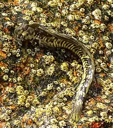 The common mudskipper (Periophthalmus kalolo) is a species of mudskipper native to marine and brackish waters of the Indo-Pacific from eastern Africa to Samoa. This species can be found in mangrove forests where it spends most of its time out of the water. This species can reach a length of 14.1 centimetres (5.6 in) SL.[1] The common mudskipper can deal with the chronic temperatures of up to 37°C and a chronic low of 14°C.[2] Larger individuals aggregate in exposed intertidal mudflats and tend to spend about 90% of their lifetime out of the water.