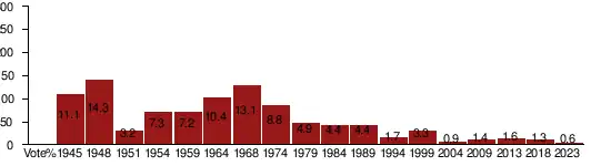In 1964, the United States State Department estimated the party membership to be approximately 500.[3] In legislative elections held in the same year, the party registered 10.4% of the vote, and won five of the Chamber of Deputies' 56 seats. The party's representation in the Chamber peaked at the following election, with six deputies, but fell, until the KPL lost its last remaining deputy in 1994. In the same year a minority opposing the Marxist-Leninist line of the party split and founded the New Left (Luxembourgish: Nei Lénk) together with the rest of the Revolutionary Socialist Party (Luxembourgish: Revolutionär Sozialistesch Partei).