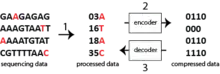 - 1 2 3 4 Wang, C.; Zhang, D. (2011). "A novel compression tool for efficient storage of genome resequencing data". Nucleic Acids Research. 39 (7): e45. doi:10.1093/nar/gkr009. PMC 3074166. PMID 21266471.