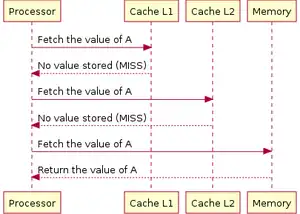 When the data is not where the processor is looking for, it is called a cache-miss. Below, pictures show how the processor fetch data when there are two cache levels.