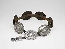 A concho or concha is a typically oval silver ornament found in Native American art. Conchos are most closely associated with the Navajo people, with one of the best known forms being the concho belt.
