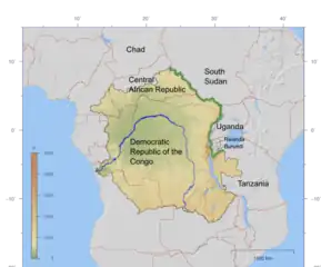 The Congo–Nile divide runs southeast and then south along the border between South Sudan and Uganda to the east and the Central African Republic and Democratic Republic of the Congo (DRC) to the west.