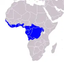 | Range of Congo and West Africa pied hornbill | |