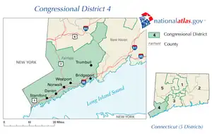 Connecticut's 4th congressional district is a congressional district in the U.S. state of Connecticut. Located in the southwestern part of the state, the district is largely suburban and extends from Bridgeport, the largest city in the state, to Greenwich – an area largely coextensive with the Connecticut side of the New York metropolitan area. The district also extends inland, toward Danbury and toward the Lower Naugatuck Valley.