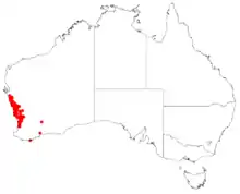 It occurs in south-western Western Australia from Kalbarri National Park to Perth and York.[4]