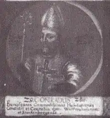 He was appointed Bishop of Hildesheim in 1221, becoming part of a new wave of bishops with a reputation for scholarship, which was at the time not common in Germany.[2] He was noted for both his ecclesiastical and temporal leadership of the bishopric.[3] During his time as bishop, he engaged in a notable disputation with Heinrich Minneke, the provost of Neuwerk, and oversaw the canonization of the recently deceased Elizabeth of Hungary, which took place on 27 May 1235. In the same year Hildesheim's episcopal and capitular temporalities (the Stift) was imperially recognized as a state of imperial immediacy, the Prince-Bishopric of Hildesheim. Conrad II died in 1249 in Schönau Abbey.[1]