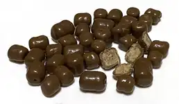 Cookie Dough Bites is an American candy owned by Taste of Nature, Inc.[1] With a cookie dough confectionery center, they are chocolate covered and most typically sold in theater-sized boxes. Although launched as a chocolate-chip cookie dough flavor, since their introduction, there have been a variety of flavors released. Originally launched in movie theaters in the US in 1997 they are now available in many areas of the world including Canada, the Caribbean, Mexico, UK, Europe/EU, several Middle Eastern countries, Australia and New Zealand