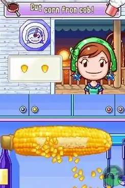 A screen capture of Cooking Mama 2: Dinner With Friends, where a player is cutting corn and Mama is dressed up to cheer for the player.