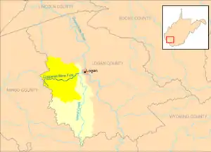 ![]() Copperas Mine Fork and its watershed, highlighted within the larger Island Creek watershed in Logan County, West Virginia. | |