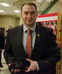 Corbin Watson (born January 6, 1987) is a Canadian Paralympic ice sledge hockey goalkeeper whose team won 3–0 against Norway and received bronze medal at the 2014 Winter Paralympics.[1] Previously, he participated at the 2013 IPC World Sledge Hockey Championships where he and his team won gold medals. An amputee, he lost his lower right leg following a car crash in 2006. Following the accident he joined Canadian sledge hockey team called Windsor Ice Bullets 2 years later in Windsor, Ontario where he was inspired by Ray Grassi, his teammate. In 2009 he won a gold medal at the Défi sportif tournament.[2]