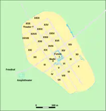There appears to have been a cattle market adjoining the forum with a market hall and several butchers' shops. A system of wooden water pipes indicates there was also an aqueduct but no public baths have been identified. The amphitheatre stood to the south-east of the town in the area now called the Querns. It was built on the site of an old quarry aligned with the street grid, an unusual feature.