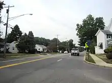At this point, CR 547 turns east to form a concurrency with CR 528 on East Veterans Highway, with CR 639 continuing north on South Hope Chapel Road. The two routes continues through residential and commercial development, intersecting CR 626 before crossing into Lakewood Township. At this point, CR 528/CR 547 becomes Lakewood-New Egypt Road and turns northeast into wooded residential neighborhoods. In this area, the routes turn east onto Central Avenue and passes more homes before crossing Lake Carasaljo and coming to an intersection with US 9. At this point, CR 528 continues northeast on Hurley Avenue and CR 547 turns north to follow US 9 on Madison Avenue, crossing the Metedeconk River, which Lake Carasaljo is formed from. After intersecting the western terminus of Route 88, Madison Avenue continues north through the commercial and residential center of Lakewood as a four-lane undivided road, with CR 547 splitting from US 9 by turning east onto two-lane 8th Street. The route passes through residential areas before splitting from 8th Street by turning northeast onto Squankum Road. Signage along US 9 shows CR 547 leaving the concurrency at 9th Street.[2] Along this stretch, CR 547 runs through wooded areas of homes, crossing CR 526.[1][2]
