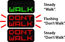 Regardless of whether pictograms or words are used, the MUTCD defines a steady "upraised hand" or don't walk signal as an indication that a pedestrian cannot enter the street in that signal's direction, while a steady "walking person" or walk indicates that pedestrians can start crossing the street toward that signal.[13] The upraised hand or don't walk signals begin to flash during the pedestrian clearance interval when the transition to the "don't walk" phase of the signal is imminent.[13] This normally occurs several seconds before the light turns yellow, usually going solid orange when the traffic light turns yellow or red; however, the display can be turned into a steady hand or "don't walk" sign while the vehicular light is yellow, or while the vehicular signal is still displaying a green light.[15] In intersections with "leading pedestrian intervals", the upraised hand or "don't walk" sign will continue flashing as the vehicular lights turn red and the other crossing(s) in the intersection display a walking person or "walk" sign. The vehicular traffic is then stopped in all directions for a short period of time before cross traffic is allowed to proceed.[16] The 2009 MUTCD states that the flashing walking person or "walk" signals do not have meaning.[13] The "flashing walk" indication was formerly used to delineate "watch out for turning vehicles"[17] and is still in use in Washington, D.C.;[18] however, as of the 2003 MUTCD, this was replaced by an optional "animated eyes" indication within the pedestrian signal display,[19][20] which was placed in the MUTCD following a study that recommended the usage of the "animated eyes" signal.[21]