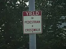 State road rules in the United States usually require a driver to yield the right of way to a pedestrian crossing a road when the pedestrian crosses at a marked crosswalk or an unmarked crosswalk.[2] In some states and cities with jaywalking laws, pedestrians may be restricted from crossing except at a crosswalk and only when the WALK signal is displayed.