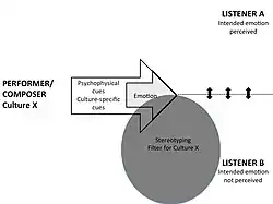 The cue-redundancy model of emotion recognition in music differentiates between universal, structural auditory cues and culturally bound, learned auditory cues (see schematic below).[2][3]