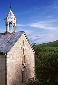 Like all Armenian monasteries, those in Artsakh reveal great geometric rigor in the layout of buildings.[38] In this regard, the thirteenth century's Dadivank, the largest monastic complex in Artsakh and all of Eastern Armenia, located in the northwestern corner of the Mardakert District, is a remarkable case. Dadivank was sufficiently well preserved to leave no doubt that it was one of the most complete monasteries in the entire Caucasus. With its Memorial Cathedral of the Holy Virgin in the center, Dadivank has approximately twenty different structures, which are divided into four groups: ecclesiastical, residential, defensive and ancillary.[39][40][41] Dadivank is an active monastery of the Armenian Apostolic Church.