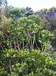 It can be grown as an attractive shrub or tree for coastal gardens, as it can withstand beach soils and winds. However, it also thrives in acidic or clay soils. It is normally a thick evergreen shrub with bisexual yellow flowers and black fruits, however it can be pruned to allow it to grow as a proper tree of up to 5 meters. [2]